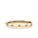 Elegant clam shell bangle in 925 Silver with diamond-like CZ stones and 14K Gold/Rose Gold plating. Hypoallergenic and skin-safe.