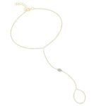925 Sterling Silver hand chain bracelet with bezel-set CZ stones in fancy shapes and 14K Gold or Rose Gold plating. Hypoallergenic and uniquely elegant.