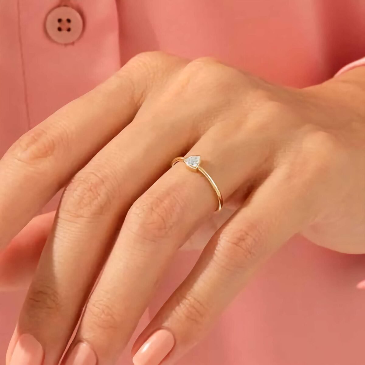 925 Silver Triangle Cut Small Solitaire Ring with dazzling CZ, 14K Gold or Rose Gold plating, and a hypoallergenic, minimalist geometric design.